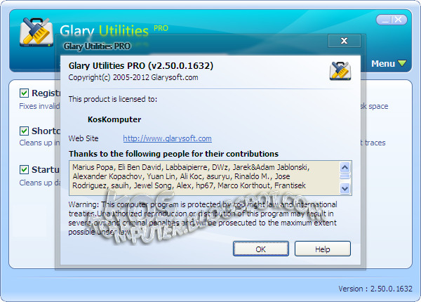 FREE Download Glary Utilities Pro 2.50 Full Version - Merupakan software all in one utilities yang sangat handal dalam mengatasi setiap permasalahan yang terjadi di dalam system komputer. Glary Utilities Pro dapat memperbaiki aplikasi error / crash, membersihkan registry dan memperbaiki kesalahan / kerusakan pada system, memiliki fitur uninstall manager yang berguna untuk menguninstall program yang sudah tidak terpakai lagi di pc tanpa sedikitpun meninggalkan junk files / file sampah, mengoptimalkan memory untuk memaksimalkan kinerja pc serta memblokir spyware, trojans, adware dan program-program jahat lainnya yang dapat mengancam keamanan pc anda.